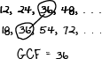 the model shows sets of multiples of the 2 numbers. the first line is 12, 24, 36, 48, dot, dot, dot. the second line is 18, 36, 54, 72, dot, dot, dot. the 36 in each line is circled, and a line connects the 2 circles. the final line is gcf equals 36.